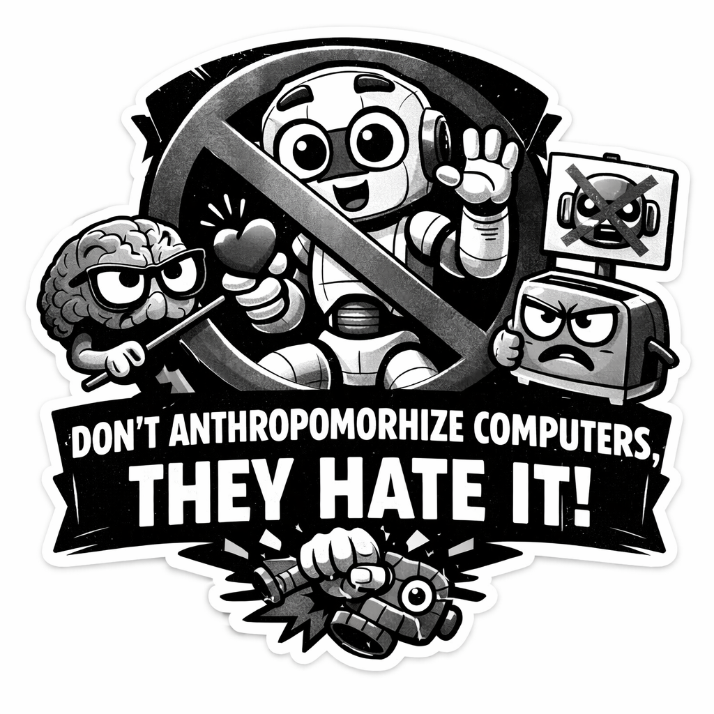 Je ziet steeds vaker mensen dingen posten over AI die dingen begrijpt, leert, denkt, hallucineert, empathisch is, meerdere persoonlijkheden heeft en ga zo maar door. Onzin, natuurlijk, het is een geavanceerde rekenmachine. Daarvoor, deze stickers.